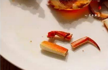 4、用剪刀把蟹腿剪成三截,最末一節(jié)蟹腳尖可充當(dāng)工具。用蟹腳尖粗的那一頭把蟹腿前段的肉頂出來。至于蟹鉗,用剪子將兩邊剪開,再向相反的方向掰兩只鉗腳,就可以將蟹鉗分開。